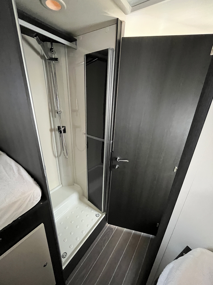 Ce mobil-home se compose d'un lit pavillon électrique, d'un lit double pouvant accueillir 3 personnes, d'un wc et d'une douche séparée. D'un salon et d'une petite cuisine.